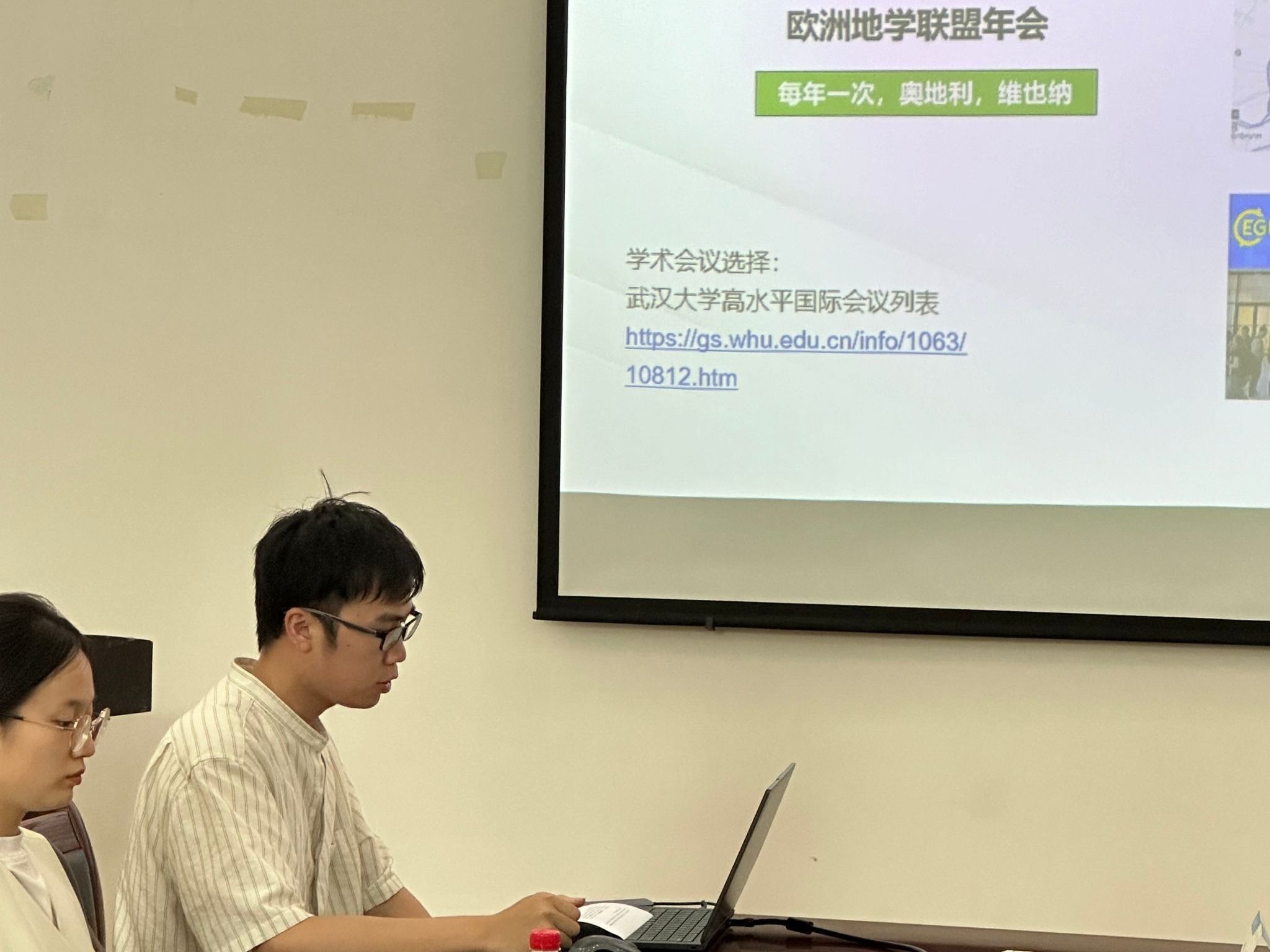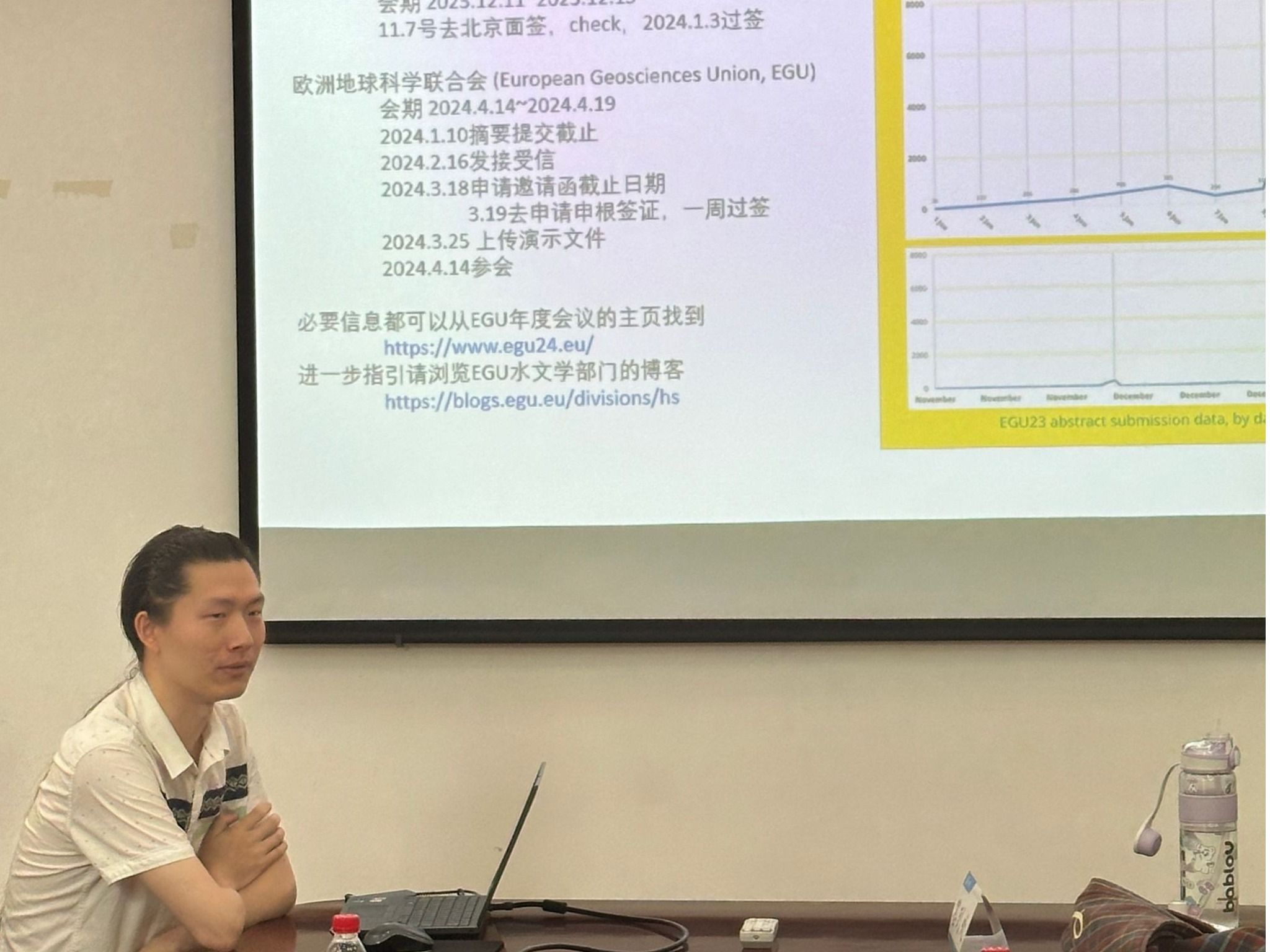 徐欢的分享主题是“EGU参会经验分享”,他展示了会议中有关口头报告、海报展示和混合展示的细节与注意事项。他还分享了水文学社区分会会议报告的参会过程,肯定了会议对学术交流和科学发展的推动效果。