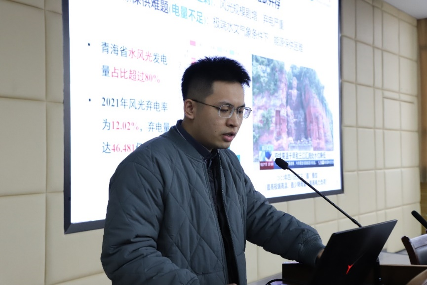 首先,程潜同学以《水风光互补系统长短期嵌套调度研究》为题进行学术报告。水风光互补是由雅砻江公司于2012年率先提出的清洁能源发电模式,在“双碳”目标下,我国的水电、风电、光电发展迅速,但弃风与弃光的问题十分突出。在此情况之下,充分发挥水轮机组的快速调节能力与常规水电或抽水蓄能的长周期储能功效,以对冲风光波动性,从而有效消减弃风、弃光,形成优质、稳定的电源。程潜同学先为大家讲述了短期调度中,水电机组运行方式的改变可能会导致水电运行效率降低,此外,目前对于互补系统弃电诱发机理也尚不清晰。因此,程潜同学提出了水风互补系统短期特征提取方法,发现了忽视短期特征导致的中长期评估失准,形成了水风光互补系统长短期嵌套决策模式。