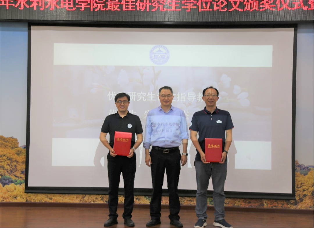 伍靖伟老师宣读表彰文件。研究生钱颖志、南天一、王珂获得最佳学位论文奖,黄介生、朱焱、陈杰和苏凯获得优秀指导教师称号。熊立华老师为他们颁奖。