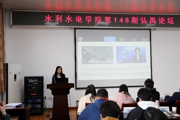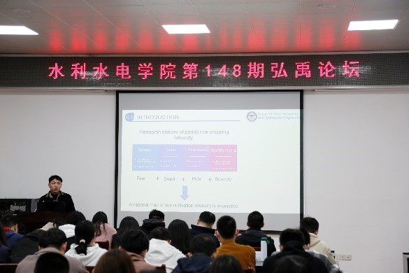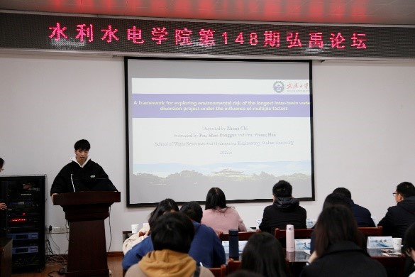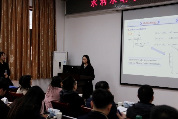 博士生李想以《Study on the competition and cooperation mechanism of reservoir pre-impoundment problem》为题进行学术报告。李想博士以博弈理论为基础,针对水库汛末的调度问题建立了数学模型,进而可以更确切地表达多个利益目标主体的竞争与合作关系,是更符合实际的调度机制。该模型对提升水库效益,建立完善科学合理的防洪、兴利部门协商合作机制具有启示性作用。