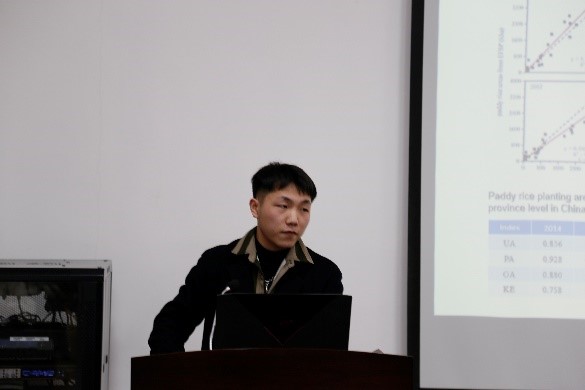 博士生魏俊以《Mapping paddy rice distribution and cropping intensity in China》为题进行学术报告。魏俊博士向我们介绍了水稻在农业耗水中举足轻重的地位以及研究水稻种植强度的重要性,通过引入有效淹水信号,探明了我国水稻种植分布与种植强度。