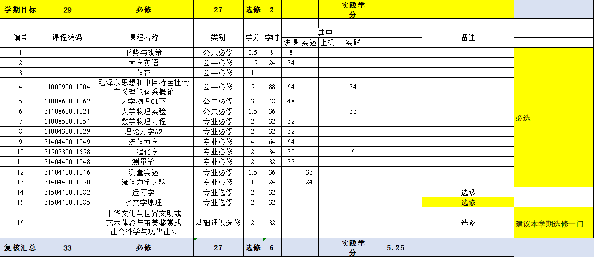 本专业的培养方案是按水利大类培养方案制定的,由于必修课程和选修课程比例的限制,部分工程教育认证标准中要求的课程被列入选修课或并入其它课程。为了保证对本专业所有学生相关基本专业能力培养不会带来不确定性,对本专业学生的选课做出了如下指导性意见: